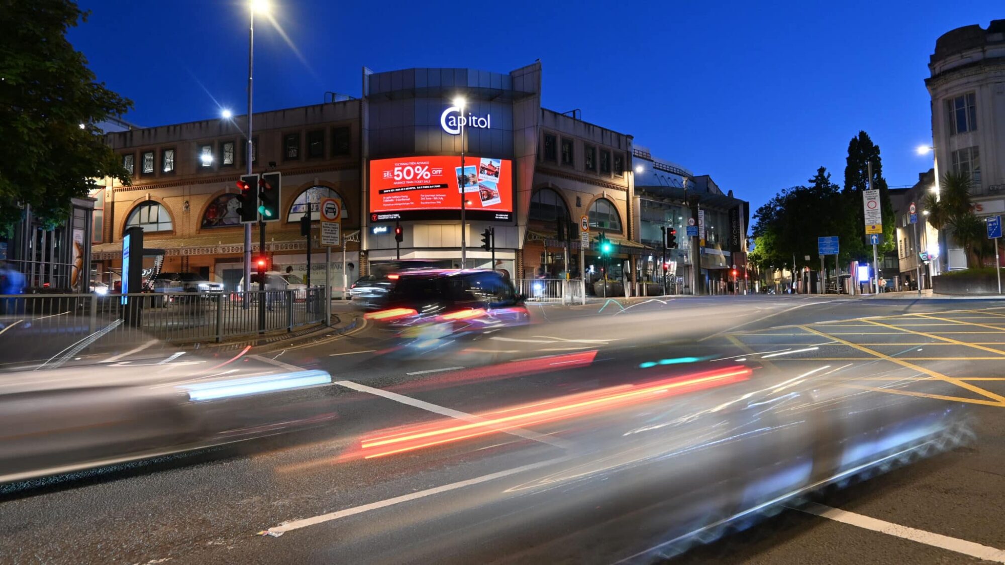 Uniquely curved and elegantly framed, this large format digital screen site occupies a prominent position in Central Cardiff. Not only does this screen sit at the heart of the Cardiff retail centre, located next to the Capital shopping centre, top of the high street and just meters away from the main Cardiff Queen St station, but it is also seen by up to 8 lanes of traffic in both directions traveling on the A4161 key arterial route. A unique site for Central Cardiff