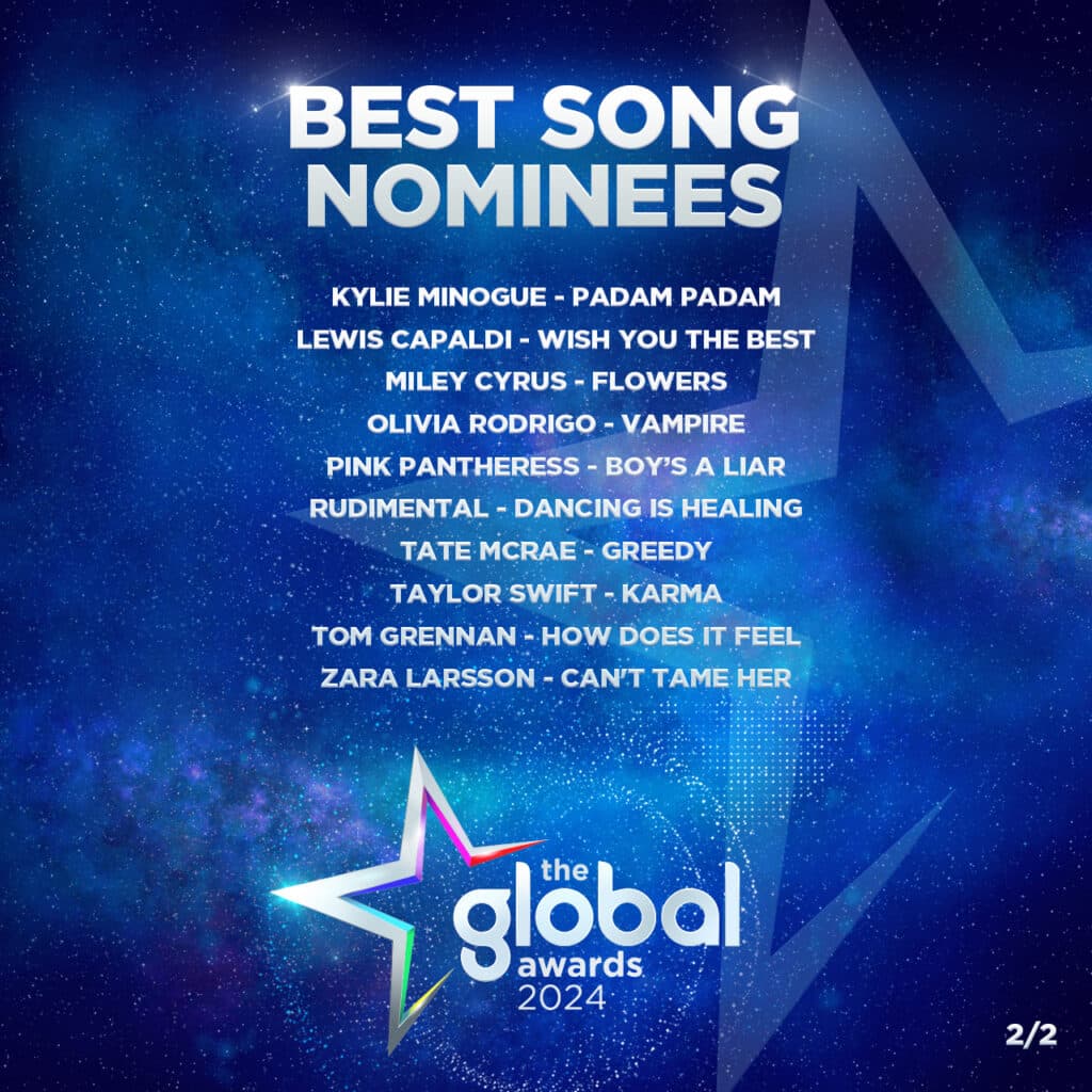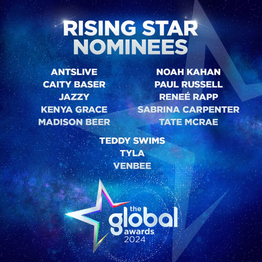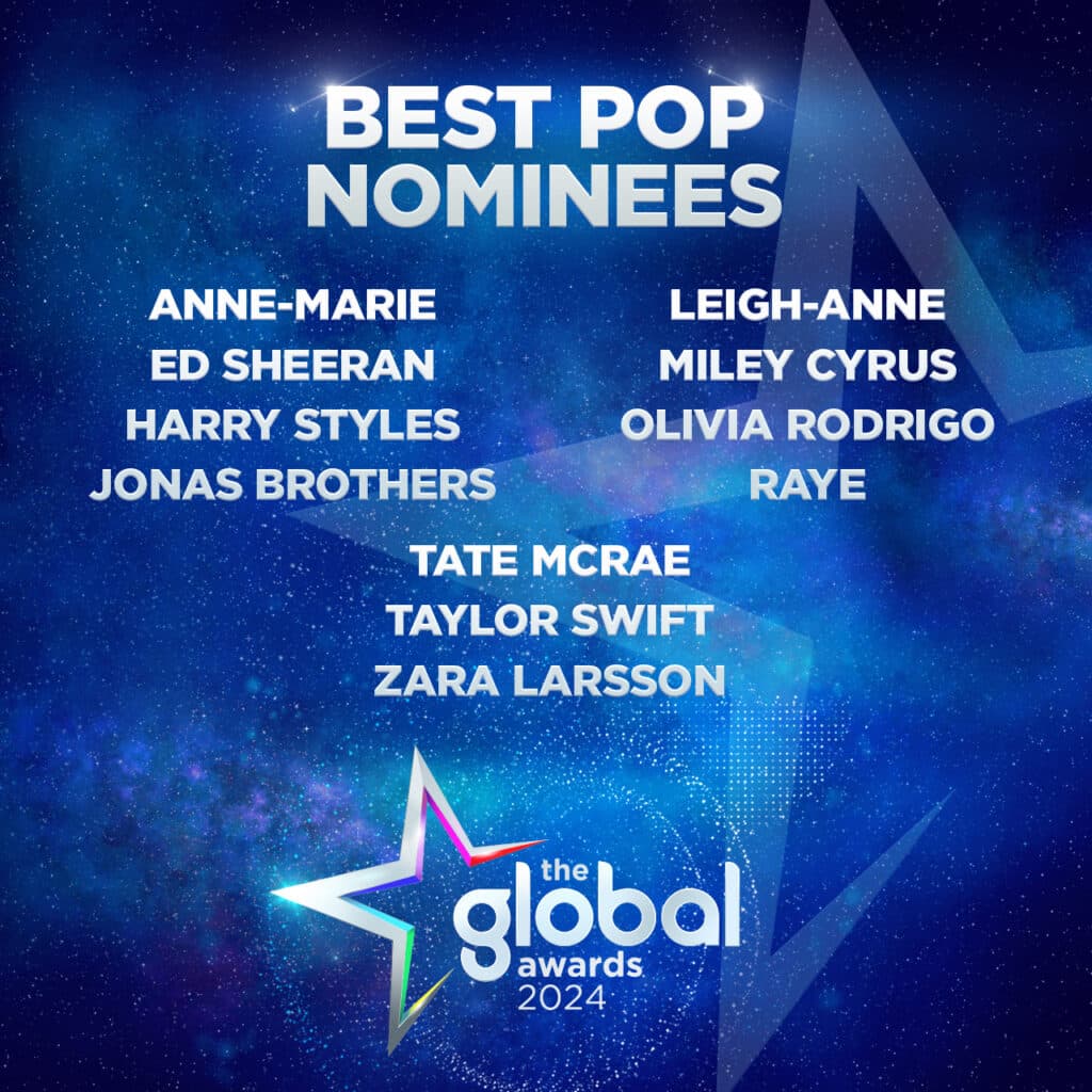 Global, the Media & Entertainment group, today (Monday 4th March 2024) revealed the shortlists for The Global Awards 2024, celebrating the biggest stars of music and entertainment across 15 exciting categories, including Best Song, Rising Star, Best Male, Best Female, Best Group and more. The categories reflect the content aired on Global’s radio stations and on Global Player, and the winners will be announced on-air on Global’s radio stations and on Global Player on Friday 22nd March 2024.