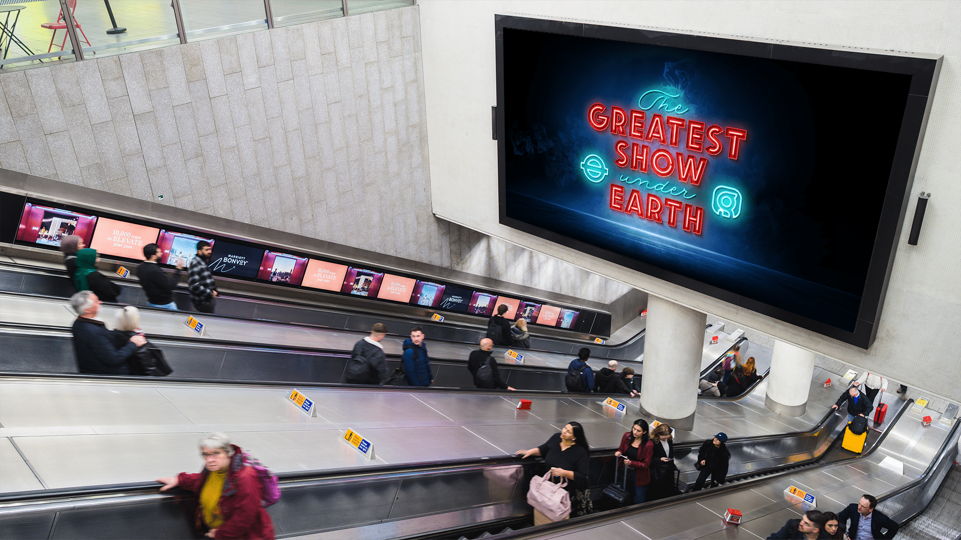 At Waterloo Tube station, Global is set to transform the station’s 160-meter-long travelator into a multi-sensory experience featuring eight massive, digital screens, combining sound, 3D visuals, scent and motion – a large format canvas that will surprise and delight every passenger.