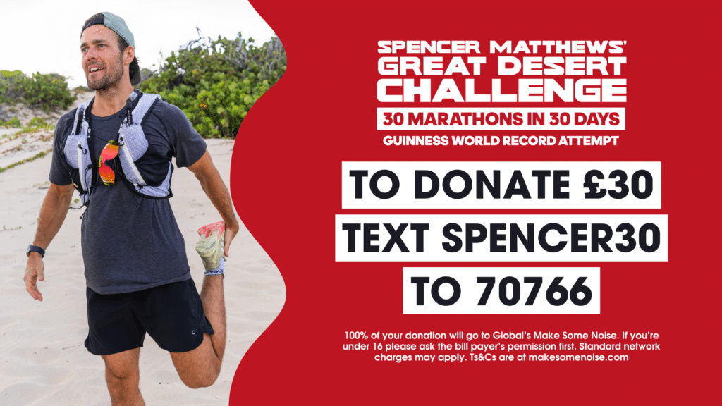 Broadcaster and entrepreneur Spencer Matthews is undertaking the challenge of a lifetime this summer as he attempts to run 30 marathons in 30 days through the Jordanian desert to raise money for Global’s Make Some Noise. If successful, the feat will earn him the Guinness World Record for the most consecutive marathons run on sand.