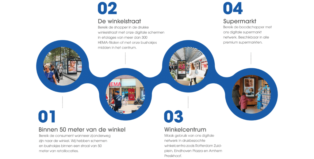 Het Retail Netwerk verbindt retailers en merken met de consument wanneer zij in een ‘shopping state of mind’ zijn. Wij bieden het meest diverse retail media van Nederland, bestaande uit meer dan 2000 schermen. In het Retail Netwerk zitten alle Digital Out-of-Home objecten in en rondom winkelcentra, winkelstraten en supermarkten, waarmee miljoenen contacten worden gerealiseerd.