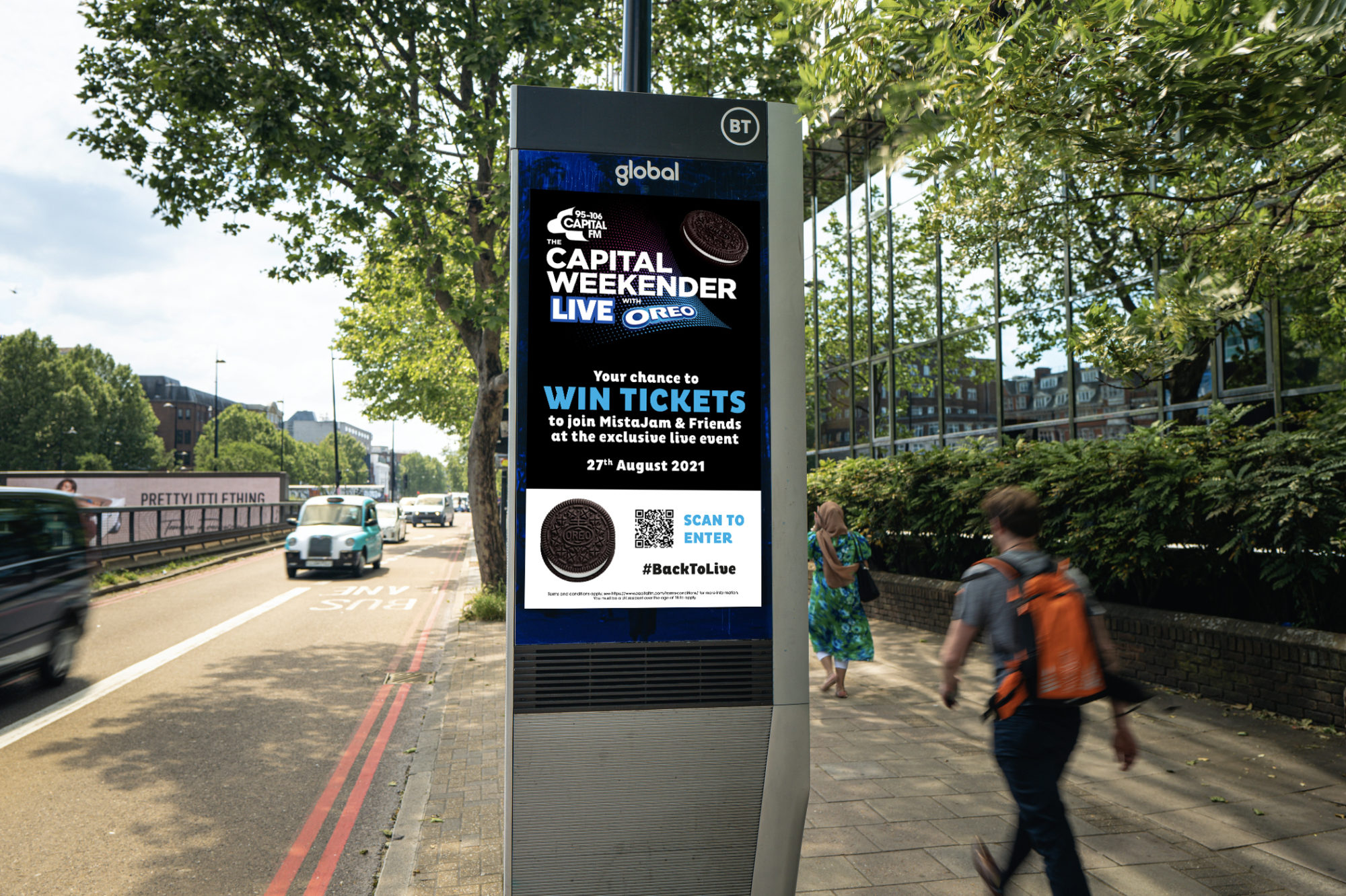 OREO’s #BackToLive media campaign promoting The Capital Weekender Live with OREO launches today (Monday 2 August) across Global’s Outdoor advertising estate, on-air, online and on DAX. From today until August 22nd music fans can enter to win tickets to the exclusive gig by scanning a QR code on a Capital Weekender Live with OREO ad featured on Global billboards nationwide.