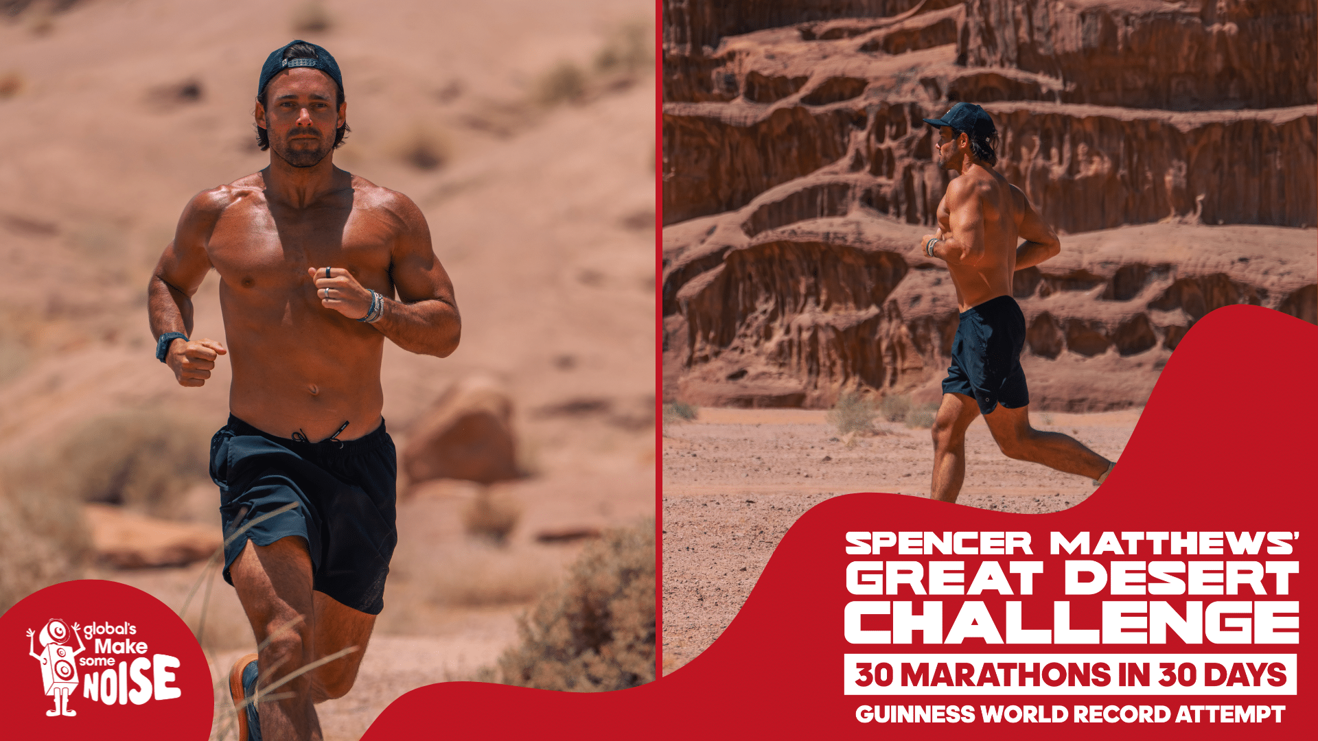 Broadcaster and entrepreneur Spencer Matthews is undertaking the challenge of a lifetime this summer as he attempts to run 30 marathons in 30 days through the Jordanian desert to raise money for Global’s Make Some Noise. If successful, the feat will earn him the Guinness World Record for the most consecutive marathons run on sand.